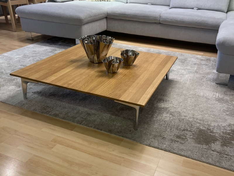 A dohányzóasztalnak tölgyfa az asztallapja. Lábai ezüst színűek.