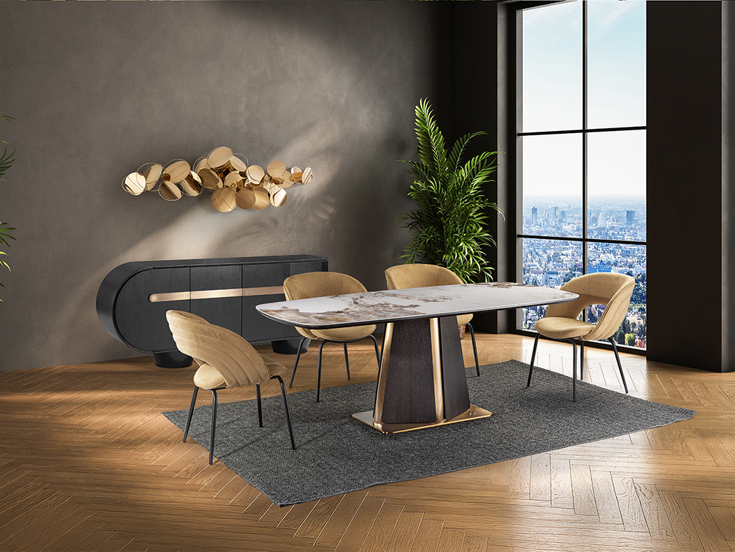Luca étkezőasztal 412094 a nemes sötét tölgy furnérozott MDF váz és a rózsaarany rozsdamentes acél részletek lenyűgöző találkozásával. Az 5 mm vastagságú, márványerezetű porcelán asztallap lágyan lekerekített élei pedig finom eleganciát, és megbízhatóságot visznek az étkezőbe.