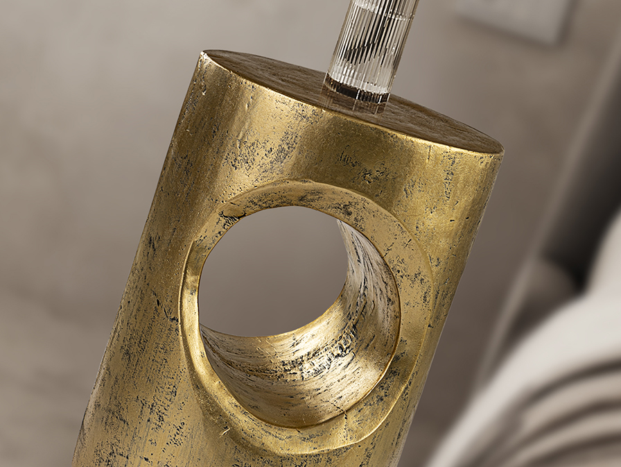 Hole kisasztal 409018 a művészi formatervezést ötvözi a modern luxussal mégpedig úgy, hogy, a bútor anyaga tűzálló, öntött magnézium-oxid, amely egy egyedi textúrát és egy masszív szerkezetet kölcsönöz ennek a darabnak. Az asztal felületét patinázott arany bevonat díszíti, amely antikolt eleganciát és meleg fényt sugároz, tökéletesen kiemelve a henger alakú testet áttörő, látványos kör kivágást. A kompakt kialakítás és a nemes felületkezelés lehetővé teszi, hogy a bútor egyszerre funkcionáljon praktikus kisasztalként és önálló modern szoborként is.