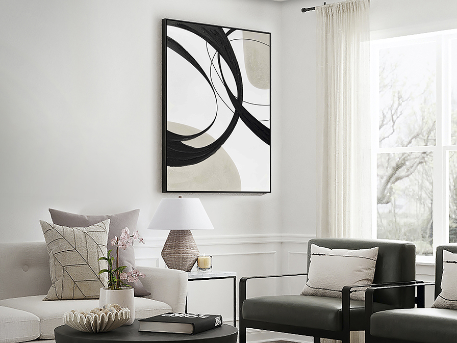 Actio II festmény 386692 akrilfestékkel készült festmény, letisztult, monokróm színvilágú, amely a fekete, fehér és lágy bézs árnyalatokra épül. Az organikus, ívelt formák és a finom átmenetek harmonikus egyensúlyt teremtenek. A kontrasztos fekete vonalak dinamizmust visznek a kompozícióba, míg a halvány, semleges tónusok elegáns, nyugodt hangulatot árasztanak feszített vásznon. Elegáns, fekete színű polisztirol keretben. Függőlegesen és vízszintesen is egyszerűen falra akasztható. Ideális választás lehet a modern és klasszikus enteriőrökbe egyaránt.