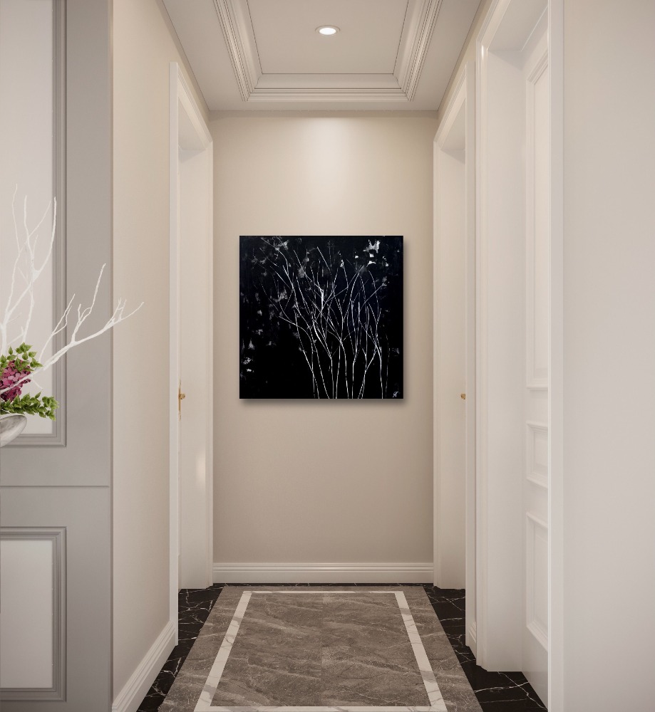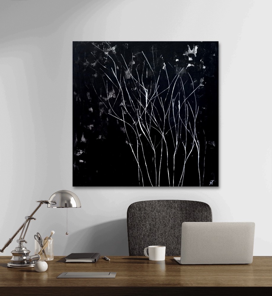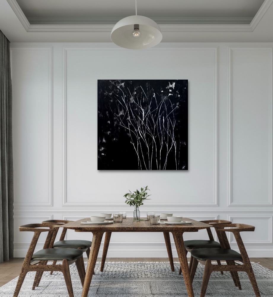 Természet (ff) sorozat; Lágy fuvallat című festmény fekete háttere szín- és tömegkontrasztjával emeli ki a finoman hajladozó fehér növényi részleteket, a minimál mintavilág pedig a sötét háttér ellenére is szelídséget közvetít. A festmény neutrális megjelenése alkalmas arra, hogy akár egy színekben dúskáló, vagy akár egy hasonlóan visszafogott, szűk színskálára épülő lakberendezés elemévé váljon. Ez a fajta látványelem bármely modern, loft, minimál, térbe jól beilleszthető. Ideális választás lehet a modern és klasszikus enteriőrökbe egyaránt.