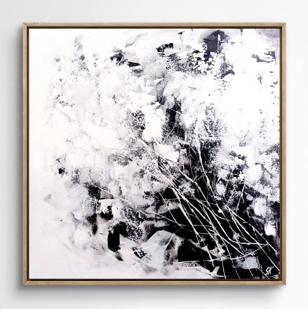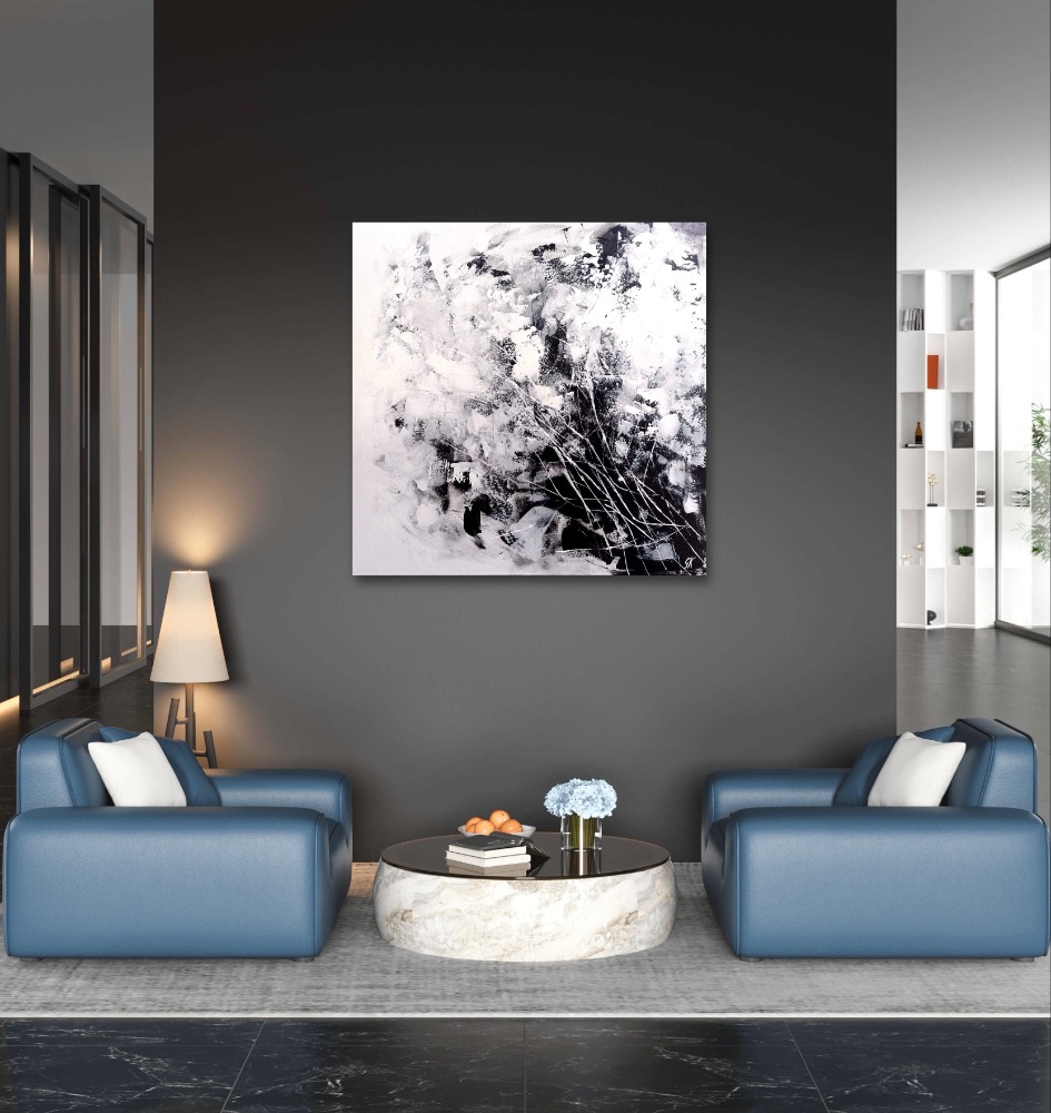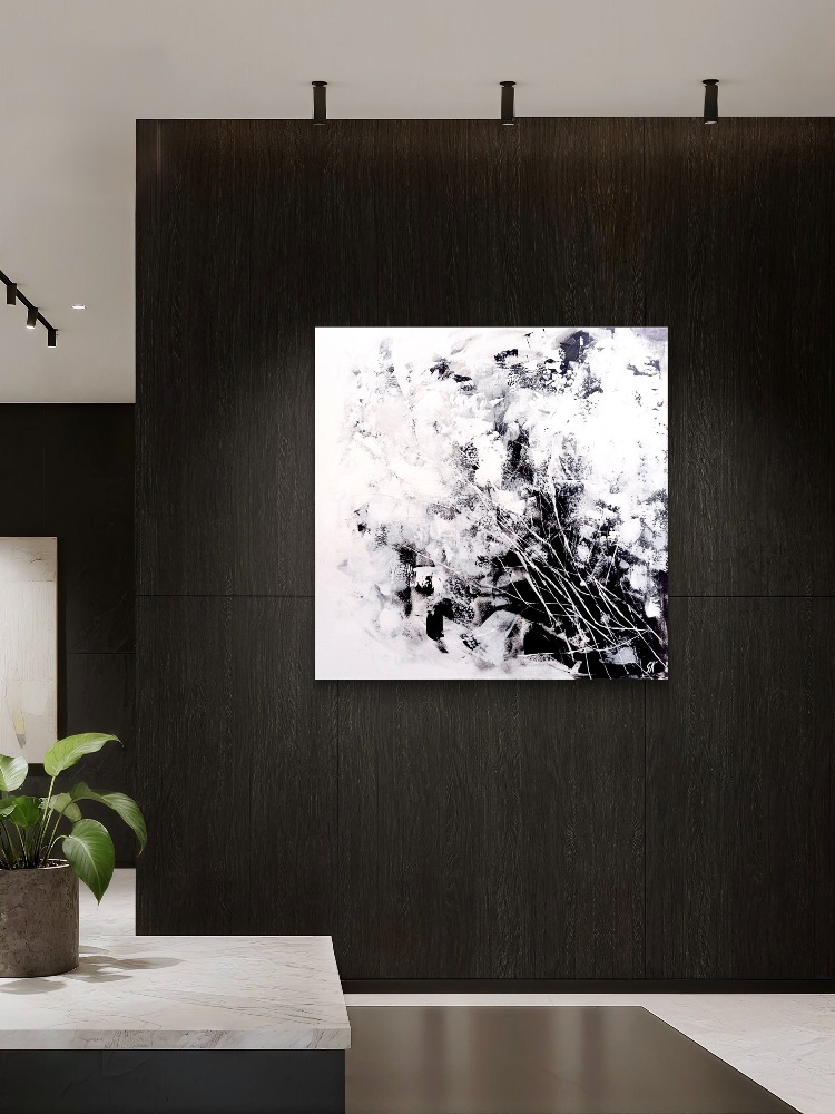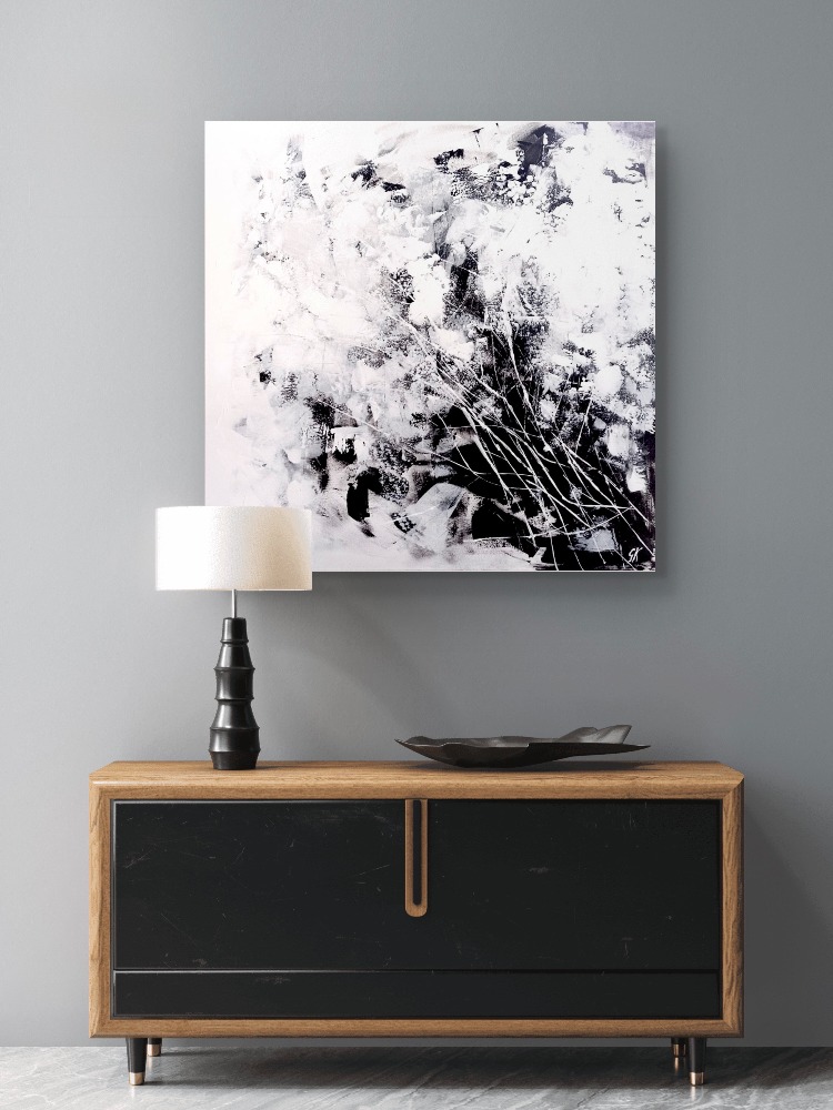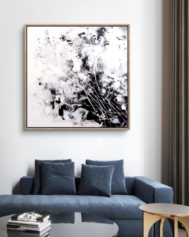 Természet (ff) sorozat; Mozgásban című festmény fekete-fehér színkontrasztja és a mintavilág formai sokfélesége aktívan tartja a figyelmünket, emellett a különböző festékrétegek optikai kölcsönhatása plusz plasztikával erősíti a látványt. Dinamikus megjelenése mellett harmonikus egységben élnek egymással a színek és formák, így végsősoron a festmény egy izgalmas, mégis kiegyensúlyozott látványt ad. A növényi mintázat a természet illúzióját csempészi bármely zárt térbe. Ideális választás lehet a modern és klasszikus enteriőrökbe egyaránt.