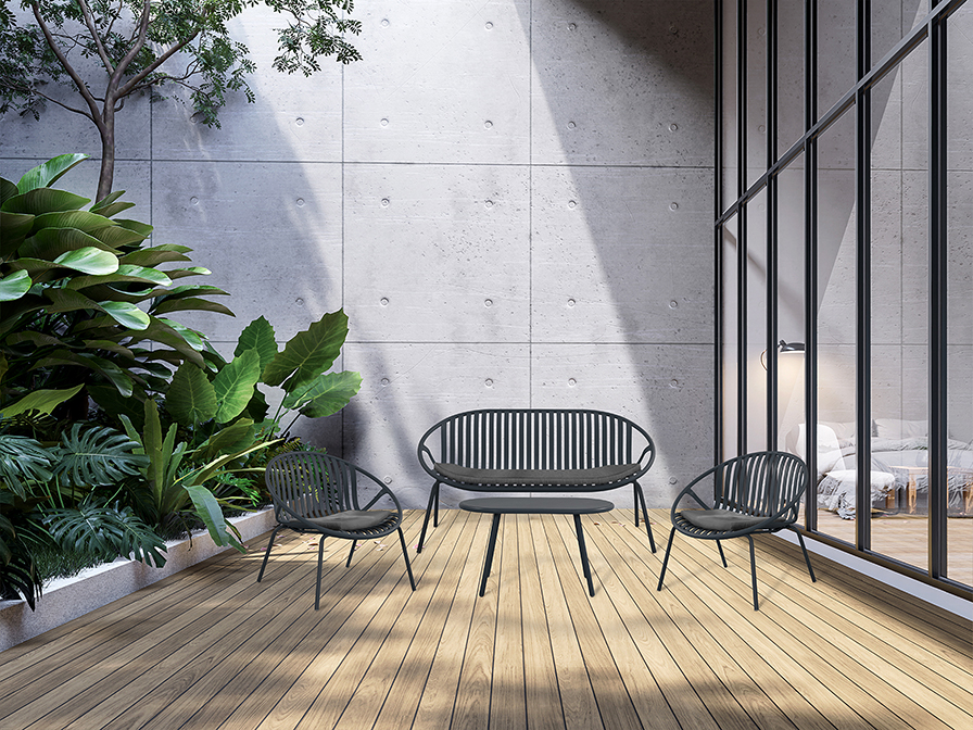 Saori kertibútor szett 564076 a modern formatervezést ötvözi a kényelemmel, úgy, hogy a sötét szürke színű polipropilén váz, és a karcsú fém lábak harmonikus egységet alkotnak. A komfortérzetet a sötétszürke, márványos mintázatú, vízlepergető anyaggal kárpitozott ülőpárnák teszik teljessé, amelyek nemcsak elegánsak, hanem a nedvességnek is ellenállnak. Ez az összeállítás ideális választás lehet teraszokra vagy kertekbe, mivel a bútorok kiválóan ellenállnak az időjárás viszontagságainak is, miközben friss, természetes megjelenést kölcsönöznek a környezetnek.
