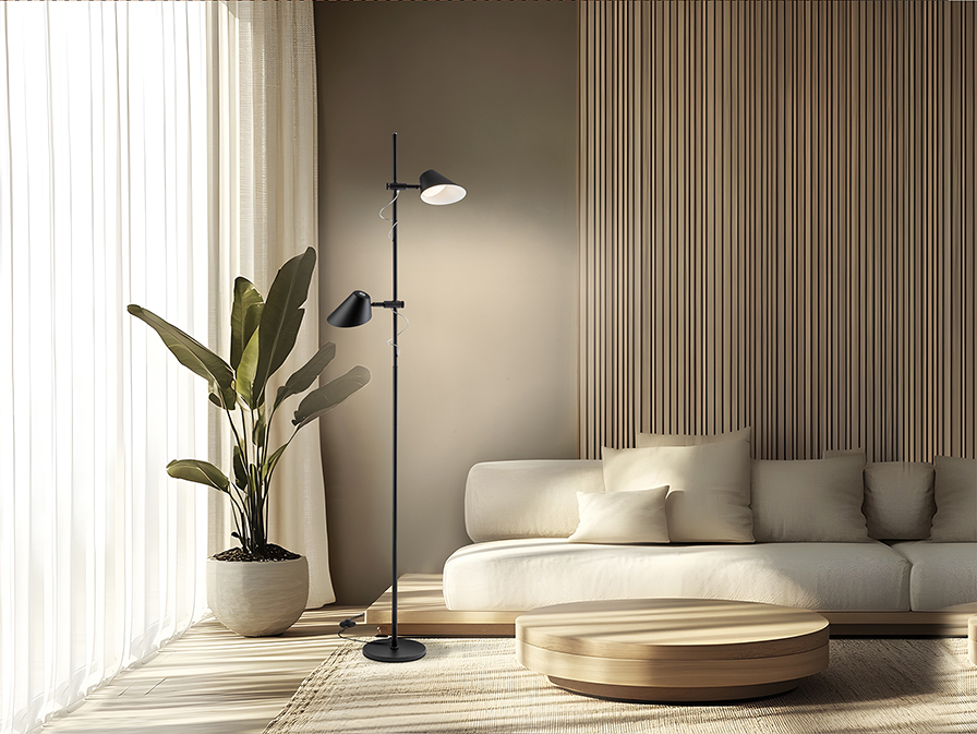 Fémből és alumíniumól készült állólámpa, matt fekete felülettel. Opál diffúzorokkal. Két különálló, tetszőlegesen állítható magasságú és forgatható lámpafejjel.