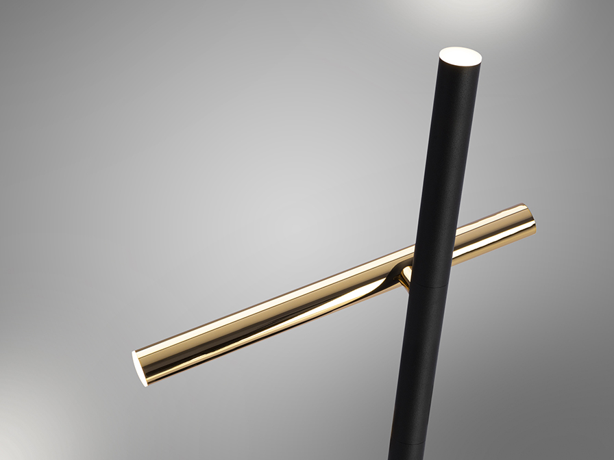 Fémből készült állólámpa, matt fekete lámpatesttel. A lámpabura opál szilikonból készült, arany kivitelben.