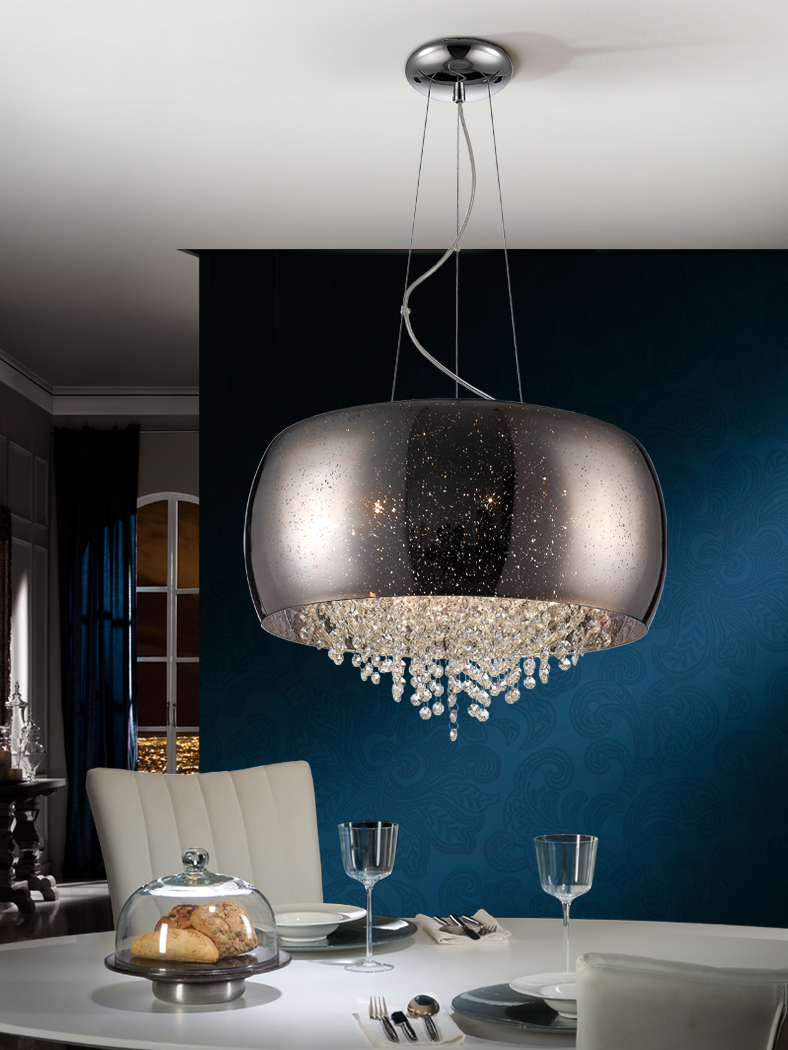 Caelum csillár 618547 a króm felületű fém váz hűvös eleganciáját és a tükröződő ezüst színű, fúvott üvegbúra modern csillogását ötvözi egyetlen művészi darabban. A lámpa vizuális középpontját a búrán megjelenő csillag hatású dekoráció adja, amely bekapcsolt állapotban varázslatos atmoszférát kölcsönöz a világításnak. A búra belsejében elhelyezett csiszolt kristálycsíkok tovább fokozzák az esztétikai élményt, mivel megtörik és megsokszorozzák a fényt, ezzel egyfajta sziporkázó ragyogással megtöltve a helyiséget. A függeszték állítható hosszúságú, így könnyedén igazítható különböző belmagasságú terekhez, vagy akár több darabot is tudunk vele kombinálni. Kiváló választás lehet nappaliba, étkezőasztal fölé vagy hálószobába is, ahol nem csak a design, hanem a funkcionalitás is találkozik.