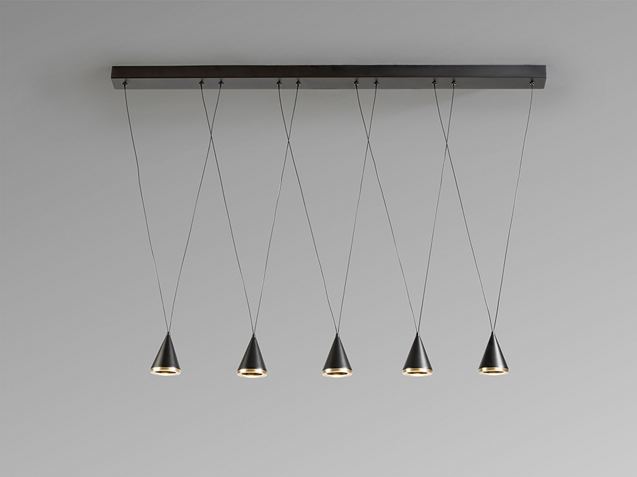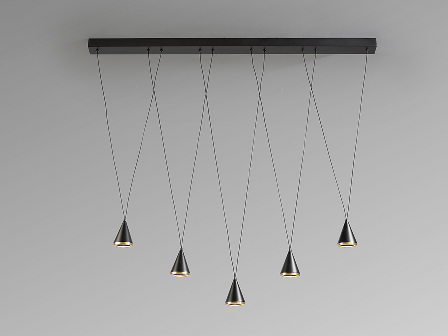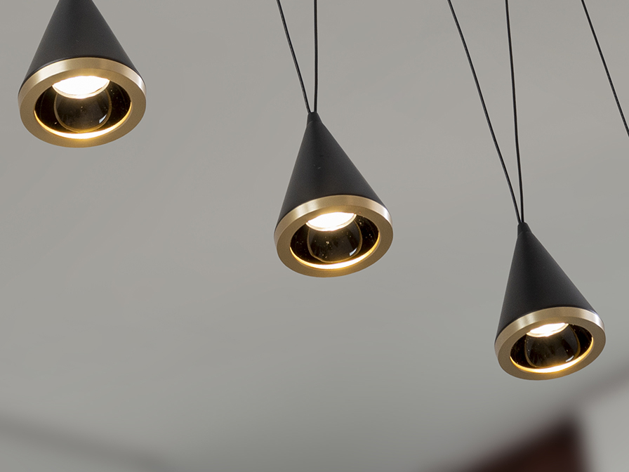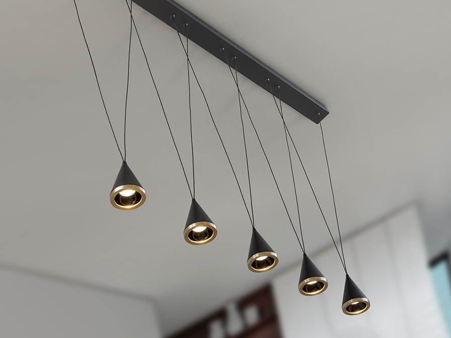 Conic csillár 768740 Ez az öt fényforrással rendelkező lámpatest a kortárs minimalizmus, és az indusztriális elegancia stílusos ötvözetét hozza el az Ön otthonába, hiszen tökéletes harmóniát teremt a fém hűvössége, és a sárgaréz finom melegsége között. A lámpa szerkezetét öt darab kecses, kúpos fém spotlámpa alkotja, amelyek ritmikus elrendezése egy határozott karaktert ad a térnek. A dizájn kifinomultságát a lámpafejeken elhelyezett sárgaréz gyűrűk emelik ki, amelyek ékszerszerű részletként vonzzák magukra a tekintetet, ezzel egy diszkrét luxust kölcsönözve a csillárnak. A technikai megoldások közül kiemelkedik még a fekete diffúzorok alkalmazása, amelyek nemcsak esztétikailag teszik teljessé a sötét tónusú megjelenést, hanem segítenek a fény precíz fókuszálásában és a vakításmentes, irányított megvilágítás létrehozásában. A függeszték állítható hosszúságú, így könnyedén igazítható különböző belmagasságú terekhez, vagy akár több darabot is tudunk vele kombinálni. Kiváló választás lehet nappaliba, étkezőasztal fölé vagy hálószobába is, ahol nem csak a design, hanem a funkcionalitás is találkozik.
