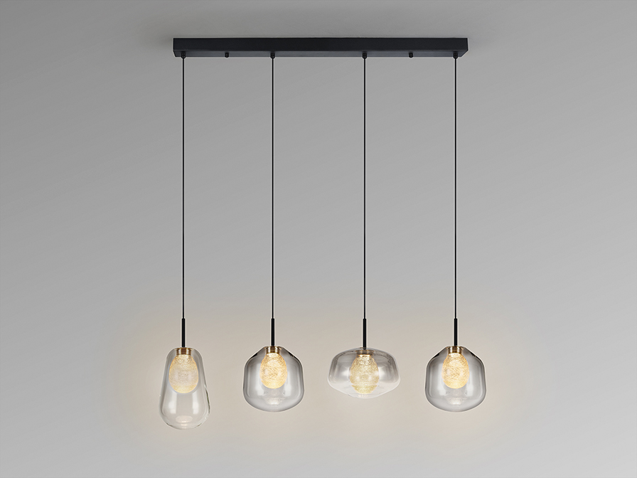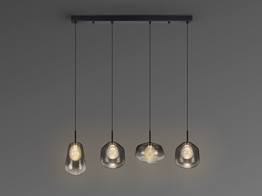 Ecos csillár 447324  Ez a négy fényforrással rendelkező függeszték a modern indusztriális megjelenés, és a kifinomult üvegművészet egy olyan különleges találkozása, ahol a matt fekete fémváz szigorú eleganciáját, a többrétegű üvegbúrák teszik lággyá, de mégis izgalmassá. A design leglátványosabb eleme a kettős falú üvegbúra, amelynek külső rétege egy látványos, füstszínűből, víztisztába áthajló színátmenettel rendelkezik, míg a belső, borostyánsárga magot apró üvegszálak díszítik. Ez a rétegzett felépítés egy rendkívül gazdag, és mély fényhatást eredményez, hiszen a fény először az üvegszálas belső magon törik meg, majd a külső füstös rétegen keresztül jut ki a térbe, ezzel egy meleg, és hívogató atmoszférát teremtve. Kiváló választás lehet nappaliba, étkezőasztal fölé vagy hálószobába is, ahol nem csak a design, hanem a funkcionalitás is találkozik.