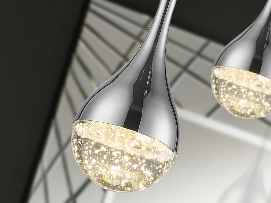 Fémből készült függeszték, krómozott felülettel. A lámpabúra csepp alakú, tömör üvegből készült, amelyet dekoratív buborékok díszítenek a belsejében. Állítható hosszúsággal.