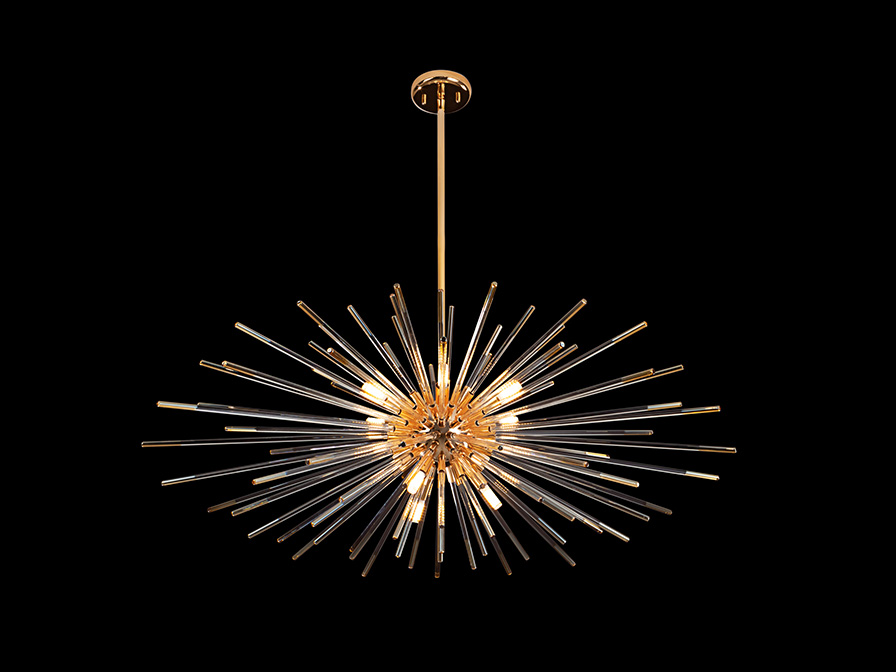 Evasion csillár 381635D Hozzon eleganciát ezzel a lenyűgöző, szferoid (gömb) formájú függőlámpával az Ön otthonába, amelynek váza fényes arany bevonatú fémből készült, ezzel luxusérzetet keltve. A lámpa fényszóró felülete sugárirányú, víztiszta üveg rudakból áll, amelyek egyedi, csillogó textúrát adnak. A rudak végei kifinomult, borostyánsárga díszítést kaptak, meleg, aranyló reflexióval gazdagítva a fényt. A csillár állítható hosszúságú, így könnyedén igazítható különböző belmagasságú terekhez, vagy akár több darabot is tudunk vele kombinálni. Kiváló választás lehet nappaliba, étkezőasztal fölé vagy hálószobába is, ahol nem csak a design, hanem a funkcionalitás is találkozik.