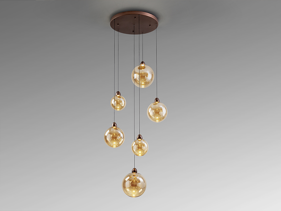 Llunas csillár 278690 Ez a lenyűgöző, hat fényforrásból álló csillár, a matt réz felületű fém, és a meleg tónusú borostyán üveg tökéletes találkozása. A kompozíciót hat darab, különböző átmérőjű üveggömb alkotja, amelyek egyfajta játékossággal, de mégis egyfajta kitűnő eleganciával ereszkednek alá a kerek mennyezeti alapról. Ez a gradiens hatás misztikus, de mégis egy egyedi fénykibocsátást eredményez. A függeszték állítható hosszúságú, így könnyedén igazítható különböző belmagasságú terekhez, vagy akár több darabot is tudunk vele kombinálni. Kiváló választás lehet nappaliba, étkezőasztal fölé vagy hálószobába is, ahol nem csak a design, hanem a funkcionalitás is találkozik.