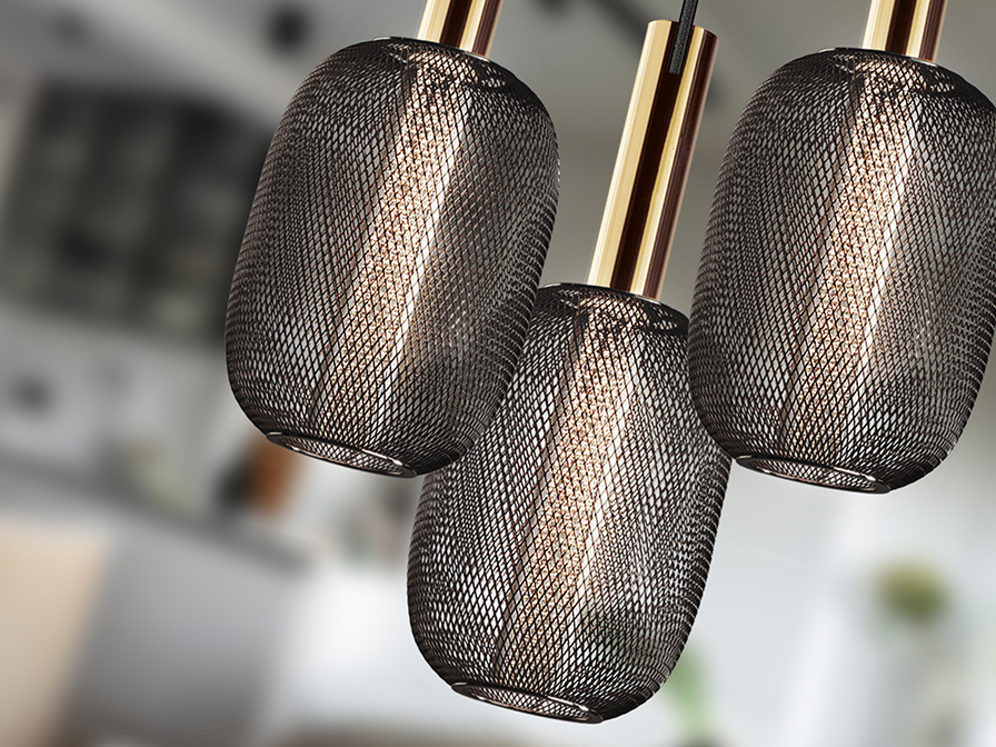 Fémből készült csillár, arany és a matt fekete részletekkel. Duplán rétegzett árnyékolóval, a belső hengerek víztiszta, buborékmintás akrilból, a külső rész pedig fekete ovális kialakítású fém hálóból készültek. Állítható hosszúsággal.