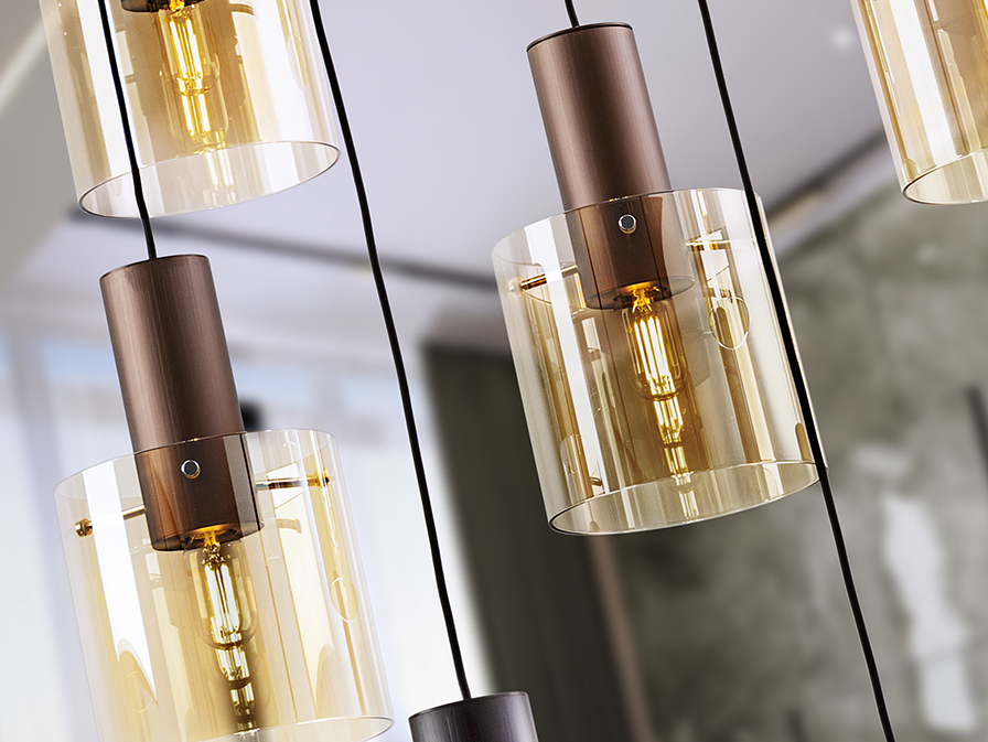 Moka csillár 237956  a fémes tónusok kifinomult játékát hozza el az Ön otthonába, úgy hogy a réz, a kávébarna és a szatén fekete felületek egy csodálatos modern, meleg összképet alkotnak. A design központi eleme a kilenc darab borostyán színű üvegbúra, amelyek lágyan szűrik meg a fényt, ezzel egy barátságos és hívogató atmoszférát teremtve a helyiségben. A különböző magasságokból aláeső búrák dinamikus, vízesésszerű látványt nyújtanak, ami különösen jól érvényesül tágasabb nappalikban, vagy nagy belmagasságú étkezőkben. Ez a gradiens hatás pedig egy misztikus, egyedi fénykibocsátást eredményez. A függeszték állítható hosszúságú, így könnyedén igazítható különböző belmagasságú terekhez, vagy akár több darabot is tudunk vele kombinálni. Kiváló választás lehet nappaliba, étkezőasztal fölé vagy hálószobába is, ahol nem csak a design, hanem a funkcionalitás is találkozik.