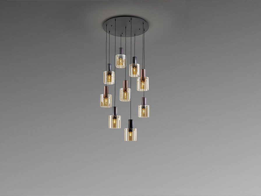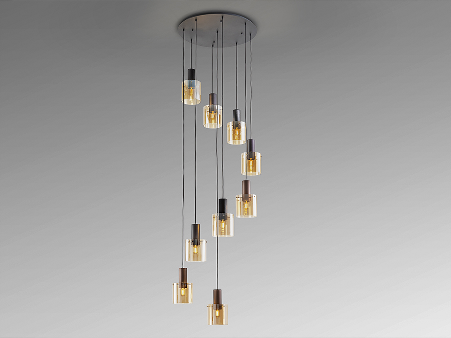 Fémből készült függeszték, szatén fekete felülettel. A lámpabúra üvegből készült, borostyán árnyalatban. Az aláeső búrák pedig dinamikus, vízesésszerű látványt nyújtanak. Hosszúsága állítható.