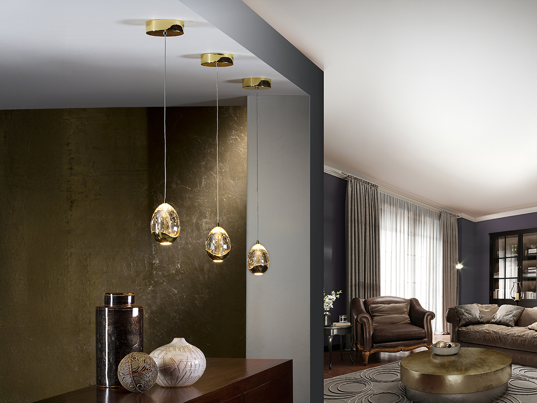 Rocio lámpa aranyozott 784347, fém LED lámpa, arany bevonattal. Ellenálló üvegből készült búrája, csepp formájú, a belsejében díszítő buborékokkal, pezsgő árnyalatban, amely gondoskodik az otthonos hangulat megteremtéséről, a lakás bármely helyiségében. A függeszték állítható hosszúságú, így könnyedén igazítható különböző belmagasságú terekhez, vagy akár több darabot is tudunk vele kombinálni. Kiváló választás lehet nappaliba, étkezőasztal fölé vagy hálószobába is, ahol nem csak a design, hanem a funkcionalitás is találkozik.