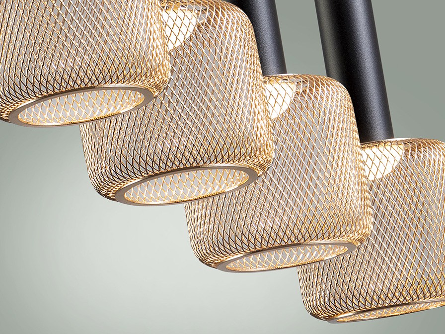 Sincro csillár 175395 Ez a négy lángú LED csillár a modern indusztriális stílus, és a klasszikus elegancia izgalmas ötvözete, ahol a matt fekete fémváz ridegségét az aranyszínű fémhálóból készült búrák teszik igazán különlegessé. Az aranyszínű hálós szerkezet nemcsak textúrát ad a lámpának, hanem a fényt egy egészen látványos módon töri meg, miközben a beépített opál akril diffúzor gondoskodik a világítás lágyságáról, és az egyenletes fényszórásról. A matt fekete és az arany felületek kontrasztja egyfajta nemes megjelenést kölcsönöz ennek a függesztéknek, amely így nem csak egy funkcionális fényforrásként, hanem egy dekoratív lakberendezési elemként is elhelyezhető bármely modern nappaliban vagy étkezőben. A függeszték állítható hosszúságú, így könnyedén igazítható különböző belmagasságú terekhez, vagy akár több darabot is tudunk vele kombinálni.