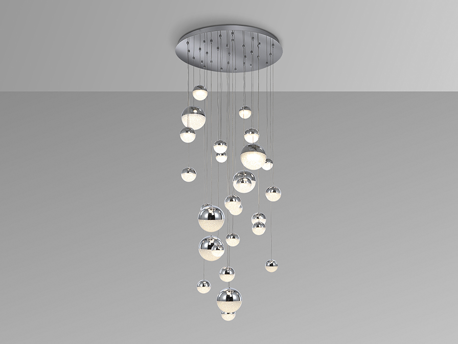 Sphere csillár 793971GK 27 égős LED-lámpa, fémből készült, króm felülettel. A lámpát polikarbonátból készült, gömb alakú búrák díszítik (Ø10 cm, Ø12 cm és Ø20 cm méretben), melyek belső textúrával rendelkeznek, továbbá a búrákat króm fémrészletek díszítik. Ezek különleges fénytörést és elegáns, ragyogó hatást keltenek, és egyszerre gondoskodnak a modern, de mégis otthonos hangulat megteremtéséről, a lakás bármely helyiségében. A csillár állítható hosszúságú, így könnyedén igazítható különböző belmagasságú terekhez, vagy akár több darabot is tudunk vele kombinálni. Kiváló választás lehet nappaliba, étkezőasztal fölé vagy hálószobába is, ahol nem csak a design, hanem a funkcionalitás is találkozik.