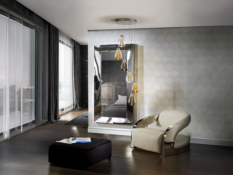 Taccia csillár 394834 fémből készült, krómozott felülettel. Kettős búrával rendelkezik: a külső körte alakú, átlátszó üvegből készült, a belső pedig tömör rúd formájú, dekoratív buborékokkal, amely egyszerre gondoskodik a modern, de mégis otthonos hangulat megteremtéséről, a lakás bármely helyiségében. A függeszték állítható hosszúságú, így könnyedén igazítható különböző belmagasságú terekhez, vagy akár több darabot is tudunk vele kombinálni. Kiváló választás lehet nappaliba, étkezőasztal fölé vagy hálószobába is, ahol nem csak a design, hanem a funkcionalitás is találkozik.