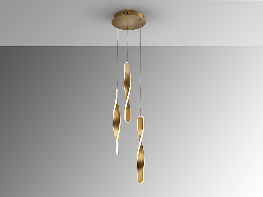 Twist csillár 219381 Elegáns, fémből készült lámpa kifinomult, szálcsiszolt arany felülettel. A fényt az opál szilikon diffúzorok lágyan, és egyenletesen oszlatják el, amely egyszerre teremt modern, ámde meghitt hangulatot a lakás bármely pontjában. A csillár állítható hosszúságának köszönhetően könnyen hozzáigazítható a különböző belmagasságú helyiségekhez, ahol akár több darabból álló látványos kompozíciókat hozhatunk létre. De a csillár remekül mutat nappaliban, étkezőasztal felett vagy akár az Ön hálószobájában is, ahol a modern design és a funkcionalitás tökéletesen találkozik.