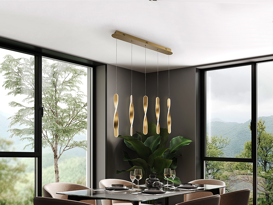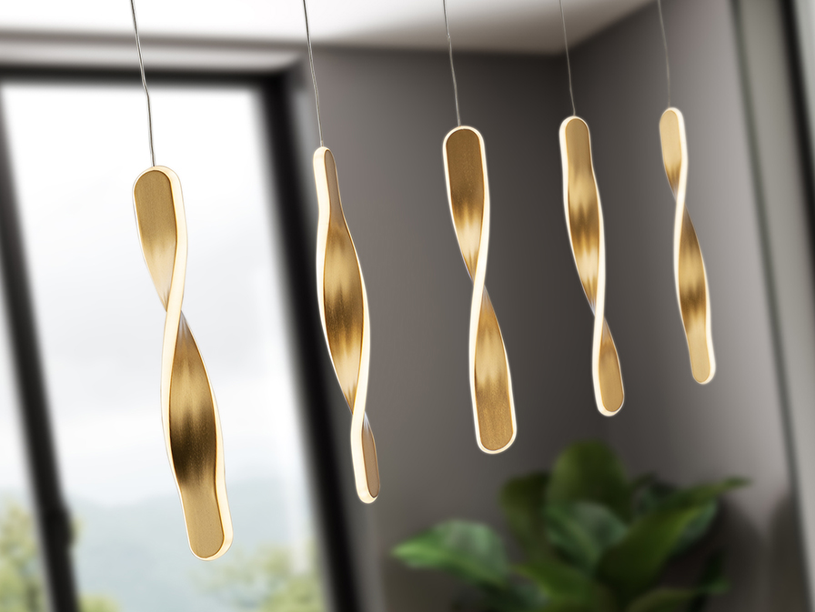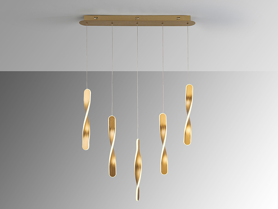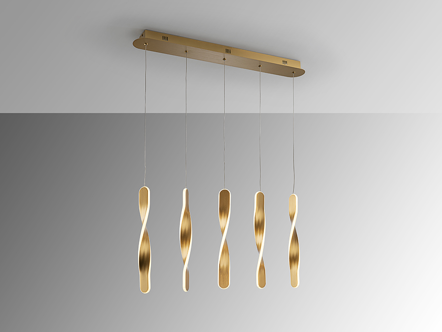 Twist csillár 219527 elegáns, fémből készült, 5 égős lámpa kifinomult, szálcsiszolt arany felülettel. A fényt az opál szilikon diffúzorok lágyan, és egyenletesen oszlatják el, amely egyszerre teremt modern, ámde meghitt hangulatot a lakás bármely pontjában. A csillár állítható hosszúságának köszönhetően könnyen hozzáigazítható a különböző belmagasságú helyiségekhez, ahol akár több darabból álló látványos kompozíciókat hozhatunk létre. De a csillár remekül mutat nappaliban, étkezőasztal felett vagy akár az Ön hálószobájában is, ahol a modern design és a funkcionalitás tökéletesen találkozik.