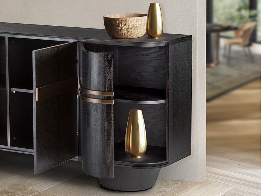 Luca komód 505260 a klasszikus sötét tölgyfa eleganciáját emeli új szintre, a különleges modern design elemeivel. A bútor váza strapabíró MDF-ből készült, amelynek sötét tölgy felülete mély, természetes karaktert visz a hálószobába. A szekrény igazi ékkövei azonban a rózsaarany bevonatú, rozsdamentes acélból készült vasalatok és díszítő részletek, amelyek a legapróbb részletekig egy kifinomult, és luxus összhatást kölcsönöznek a darabnak. A funkcionalitás és az esztétikum itt kéz a kézben jár; hiszen a négy tágas ajtó mögött bőséges hely rejlik a ruhanemű diszkrét tárolására, így a környezet mindig rendezett maradhat.